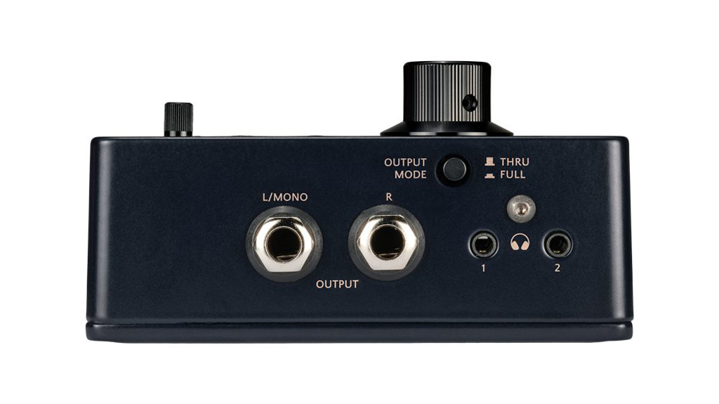 Dazu kommt ein umschaltbarer Output-Modus. Im Modus FULL wird das komplette Signal inklusive Aux-Anteil an die Main Outputs weitergegeben. Im Modus THRU wird der Aux-Weg aus den Hauptausgängen entfernt; dann arbeitet die Box praktisch als gebufferter Stereo-Ausgang für das restliche Rig. Das kann vor allem dann nützlich sein, wenn Backing-Tracks nur auf dem Kopfhörer landen sollen, aber nicht am Hauptausgang.