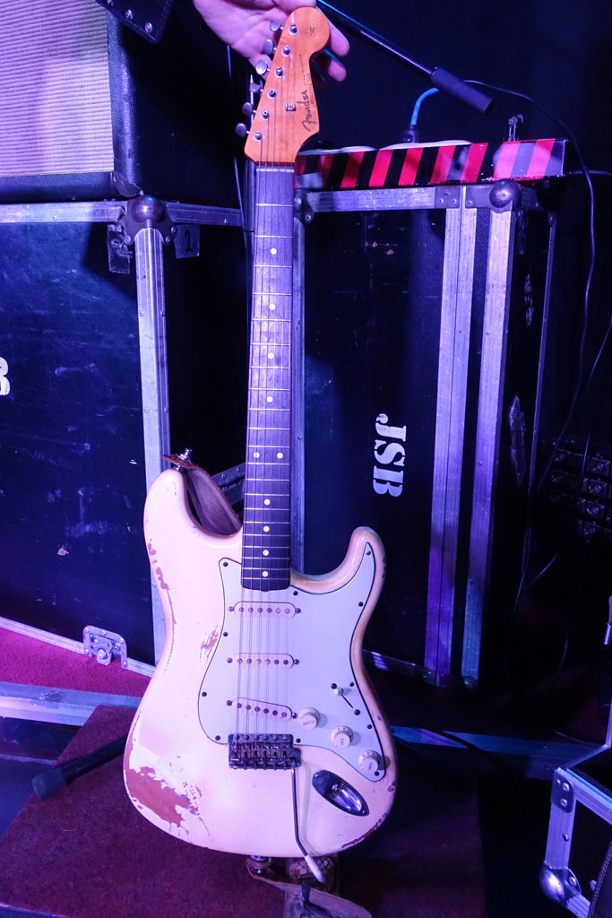 Die Telecaster habe ich gebraucht für ganz kleines Geld gekauft. Der vorherige Besitzer behauptet, es handele sich um ein mexikanisches Modell. Ich wollte unbedingt eine Fender Telecaster mit Palisander-Griffbrett, weißem Korpus und schwarzem Pickguard, als Andenken an den kurz zuvor verstorbenen Status-Quo-Gitarristen Rick Parfitt. Deshalb trägt die Gitarre den Spitznamen „Ricky”.