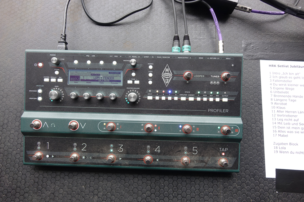 Außerdem finde ich es absolut beruhigend, wenn mein Setup immer und überall gleich klingt. Ich habe meine Lieblingsamps – einen Fender Deluxe Reverb Reissue und einen Marshall DSL 100 der ersten Serie – selbst geprofiled und benutze die Sounds auch überwiegend für die Live-Gigs. Für Aufnahmen nehme ich auch gerne die Michael-Britt-Profiles, die absolut fantastisch sind.