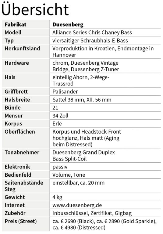 Sympathische Bässe für einen sympathischen Musiker! Aufbauend auf einer altbewährten Formel schafft es Duesenberg, dem Alliance Series Chris Chaney Bass eine eigene Identität zu verleihen. Der Sound ist dabei dank bester Holzgrundlage und den Custom Duesenberg Grand Duplex Bass Pickups klassisch ausformuliert, die Bespielbarkeit ist so entspannt, wie sie nur sein kann – die Abwesenheit von Kopflastigkeit, die fantastische Bundierung, und der schlanke Hals wirken perfekt zusammen. Wie ich es von Duesenberg nicht anders erwartet hätte, ist an der Verarbeitung, auch mit skeptischer Lupe betrachtet, rein gar nichts zu beanstanden. Das gilt auch für den Bass in Distressed Black.