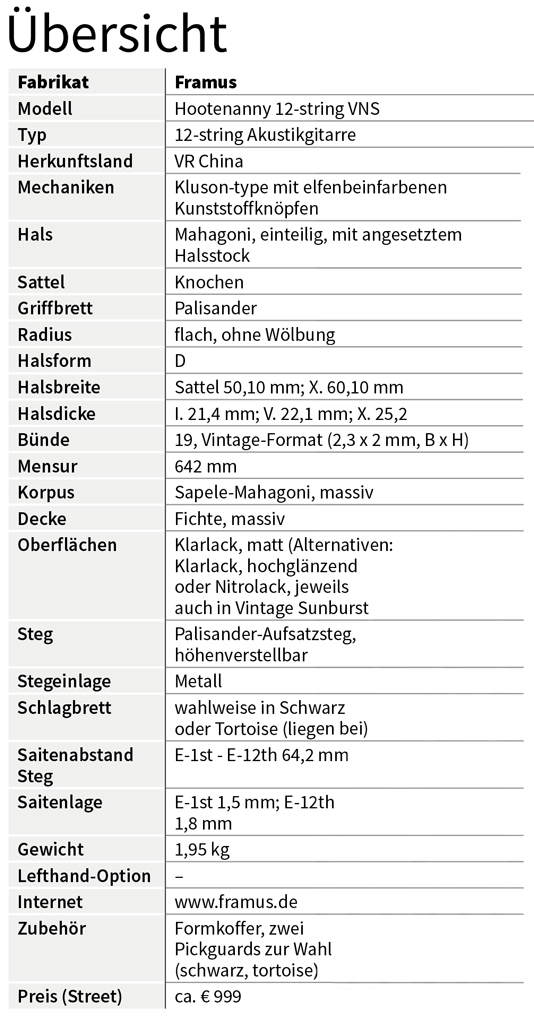 Die Rosette um das Schallloch ist genau wie beim Vintage-Original aus einzelnen Holzstücken zusammengesetzt, damals wie heute ein auffälliges und optisch gelungenes Merkmal der Hootenanny. Ebenfalls wie damals ist die Gitarre ist in zwei Farben zu bekommen: Natural und Vintage Sunburst, heute bietet Framus sogar pro Finish drei verschiedene Ausführungen an: Vintage Tinted Satin, Vintage Tinten High Polish und Vintage Tinted Nitro. Mir liegt für diesen Artikel die ursprünglichste und auch preisgünstigste Form der 12-string Hootenanny vor – die in Vintage Tinted Satin, also der Typ VSN.