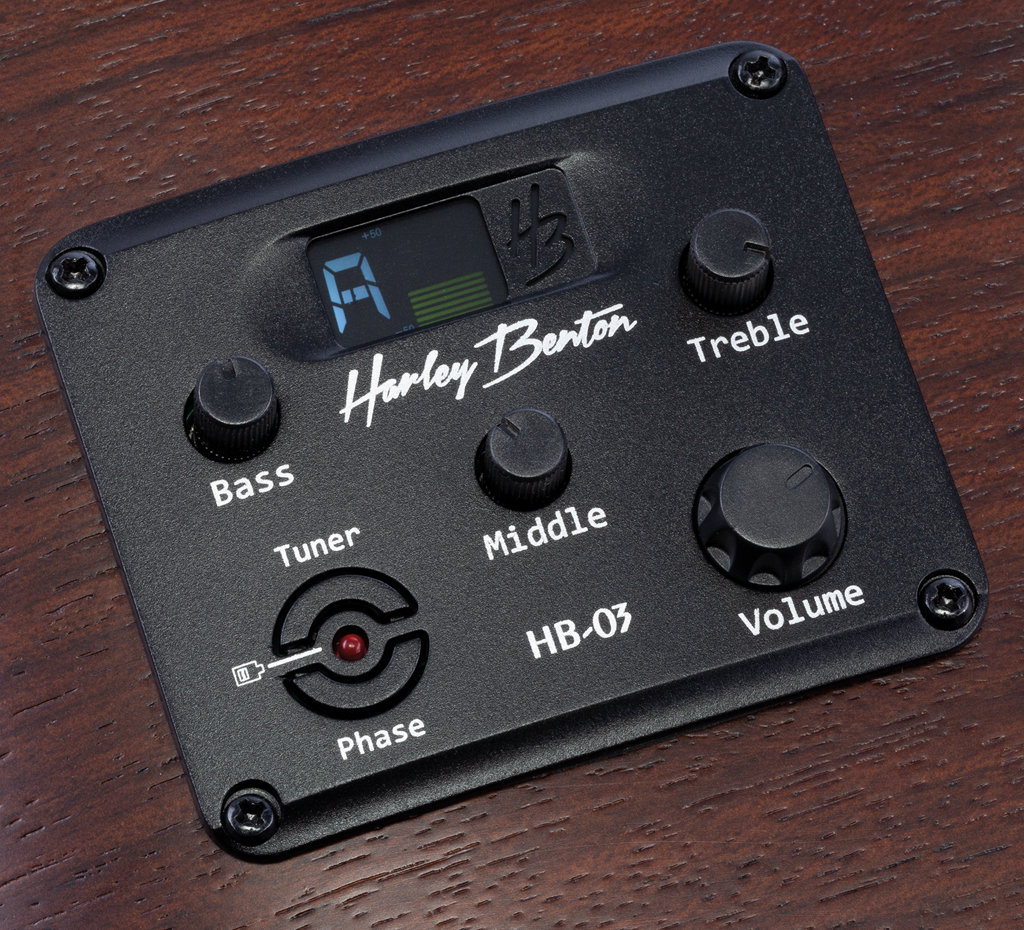 Auch ein Pickup-System ist an Bord: Es heißt HB-03 und kommt aus eigenem Hause. Das Cockpit auf der Zarge bietet Regler für Volume, Bass, Middle und Treble sowie einen Phase-Taster und ein Stimmgerät.