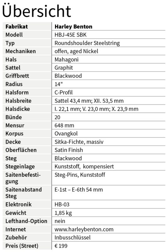 Was die ersten Akkorde sofort zutage fördern, ist ein erstaunliches Maß an Klangfülle, Dynamik und Sustain, was so in dieser Preisklasse nicht selbstverständlich ist. Die Bässe haben nicht gänzlich dieses trocken-holzig-abgehangene einer J-45, dafür erreichen sie aber dank der längeren Mensur eine Tightness und Klarheit, die überzeugen kann. Das Gleiche gilt auch für den Mittenbereich und die Höhen. Die Harley Benton gibt sich hier ganz klar als Allrounder. Gerade dadurch, dass sie keinen extrem ausgeprägten Charakter hat, kann man mit ihr eigentlich alles machen. Die gute Saitenspannung macht Fingerpickings schön transparent, der klare Sound – zusammen mit der sehr ordentlichen Dynamik – lassen sanftes bis hartes Strumming gut zur Geltung kommen. Und über Amp? … bleibt der Gesamteindruck genau so positiv. Der Piezo-Pickup unter der Stegeinlage verstärkt die Saiten ausgewogen und gleich laut, die drei Klangregler rasten in Neutralstellung leicht ein und bieten sinnvolle Regelwege für Klanganpassungen. Ich nehme nur ein wenig die Mitten weg, ein kleiner Schuss Höhen – und schon passt das für mich.