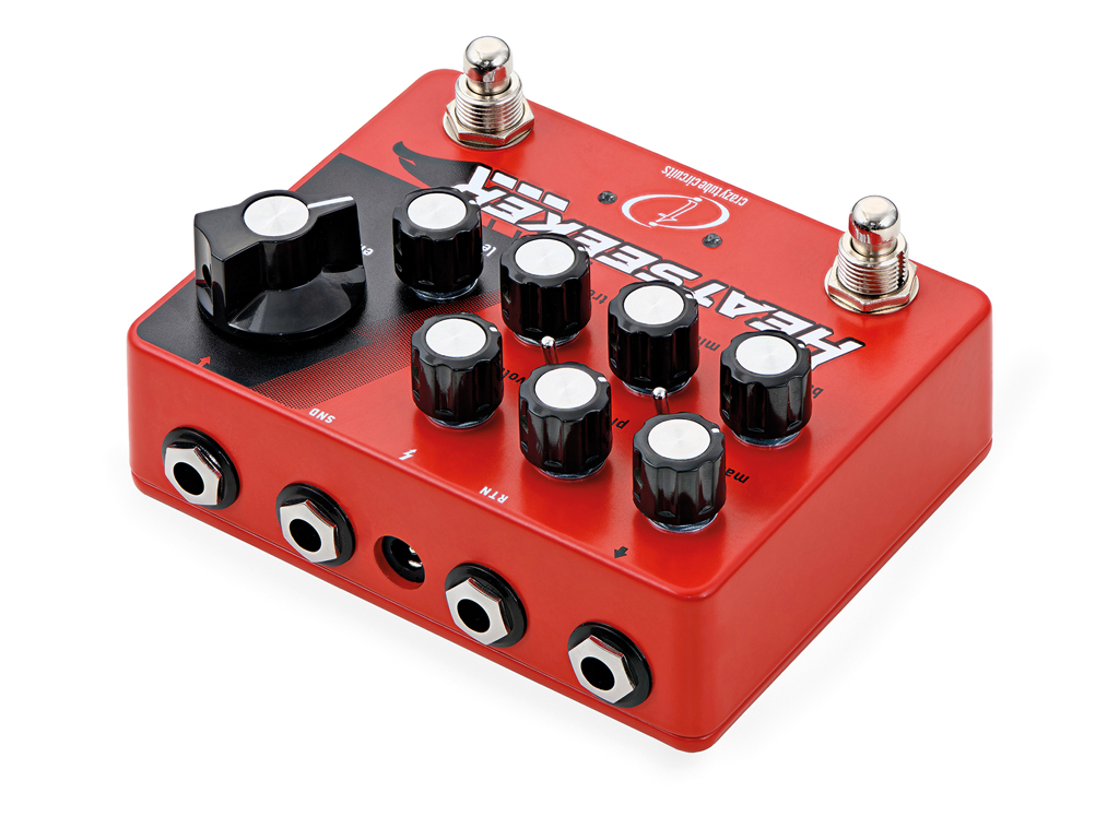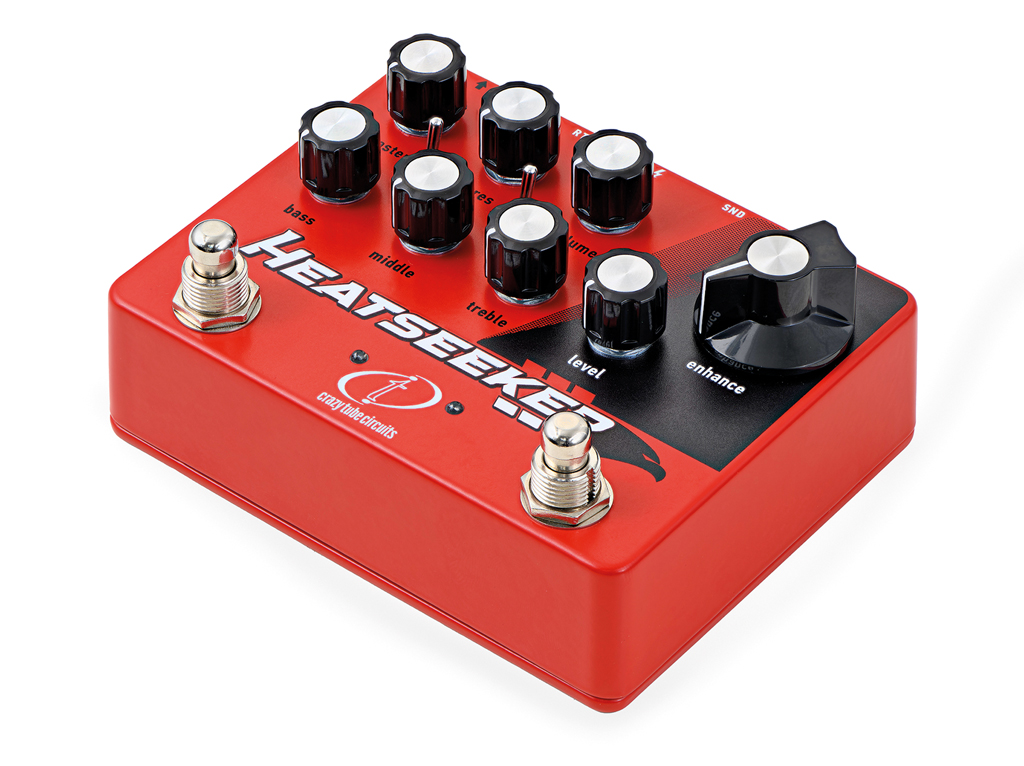 Das Heatseeker-Pedal kommt im Querformat, das Crazy Tube Circuits gerne benutzt, wenn das Gerät etwas aufwendiger sein darf. Auf zwei Dritteln der linken Seite befindet sich ein Zerrpedal, dessen Ausstattung an einen klassischen Marshall-Verstärker angelehnt ist. Neben Reglern für „Bass”, „Middle” und „Treble” verfügt es zudem über einen „Master”-Volume-, einen „Presence”- sowie einen Gain-Regler, der hier etwas irreführend mit „Volume” bezeichnet wird. Zwischen den Reglern sind in der oberen Reihe zwei kleine Minischalter platziert.