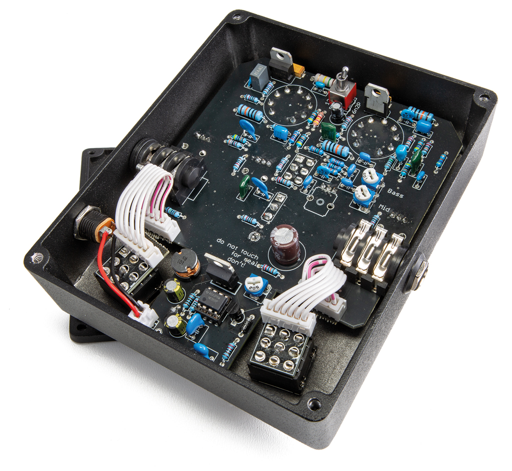Regelbar sind die Intensität der Verzerrung, die Klangfarbe (Tone), die Ausgangslautstärke und ein auf die Bezeichnung Cut getauftes Hochpassfilter, das zunehmend Bässe aus der Verzerrung entfernt, um das Klangbild aufgeräumter zu gestalten. Der rechte Fußschalter versetzt die Schaltung in den Bypass-Modus, der linke Fußschalter wählt zwischen drei und vier Gainstufen (grün, rot). Schließlich gibt es einen dreistufigen Bite-Bright-Schalter sowie einen Schalter, mit dem sich das Pedal ausgangsseitig zu einer autarken Vorstufe konfigurieren lässt, die sich vor einem Verstärker oder einer Endstufe nutzen lässt.