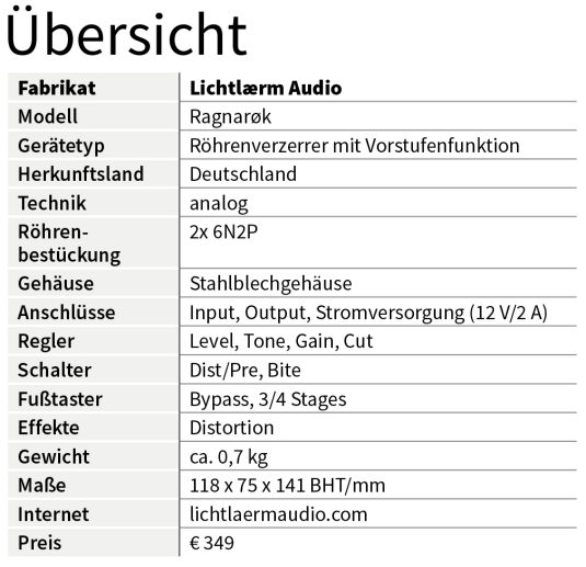 Mit dem Ragnarøk gelingt Lichtlærm Audio ein röhrenbetriebenes Pedal, das sich technisch als Mischung aus Overdrive, Distortion und Vorstufe versteht. Die Bedienung und Funktionalität sind gleichermaßen geradlinig und auf den Punkt. Einen passenden Verstärkerkanal vorausgesetzt, erhält man eine leistungsstarke zweistufige Erweiterung der Zerrreserven und darf dabei auf den bewährten Klangcharakter echter Röhren vertrauen. Kurzum: Eine absolute Empfehlung! ●