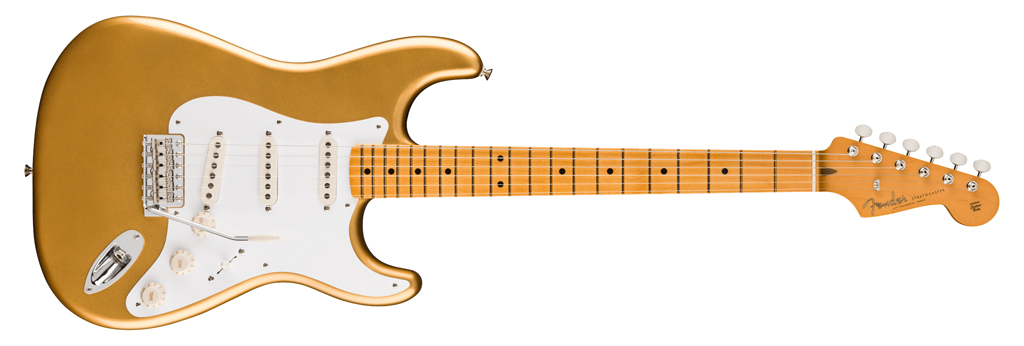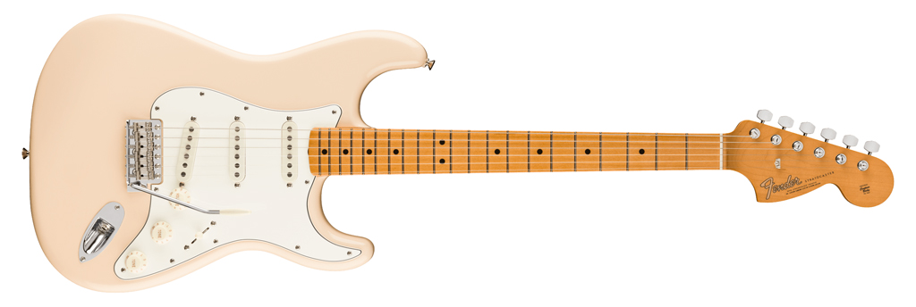 Die späten 50er werden hier mit Erlekorpus, einteiligem Ahornhals samt Ahorngriffbrett, einem kräftigeren Late-’50s-D-Profil sowie drei entsprechend abgestimmten Single Coils aufgegriffen. Dazu kommen 7,25″-Radius, Vintage-Tall-Frets und ein Vintage-Style-Synchronized-Tremolo.
