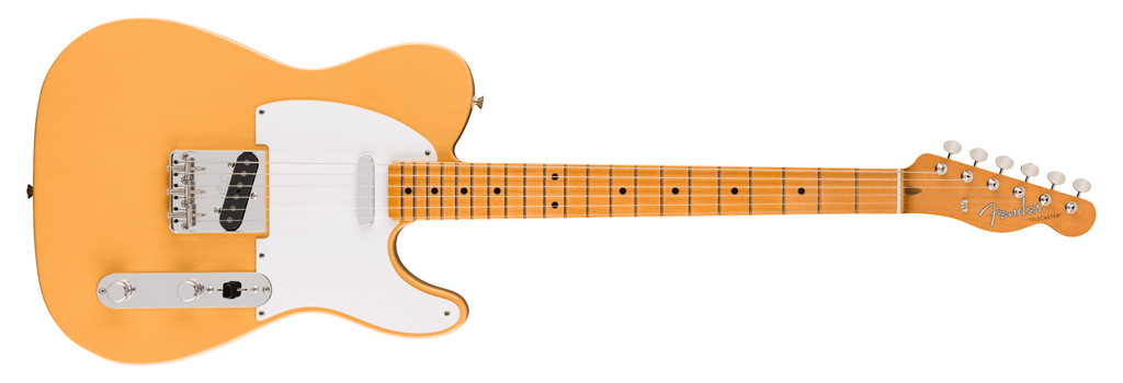 Die späte 50s-Tele arbeitet mit Esche- oder Erlekorpus, einteiligem Ahornhals, V-Shape-Halsprofil und zwei entsprechenden Single Coils. Die Vintage-Style-Bridge mit drei Barrel-Saddles aus Stahl soll die typische Tele-Ansprache dieser Zeit abbilden.