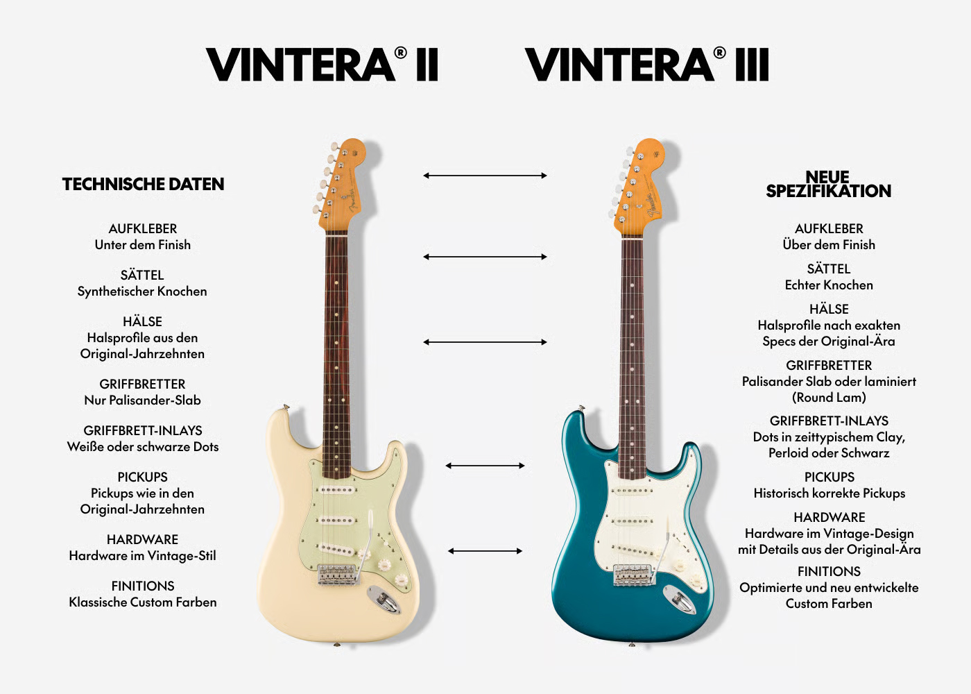 Die neue Vintera-Generation will nicht einfach nur „retro“ sein, sondern bestimmte Fender-Epochen genauer treffen – mit zeittypischen Pickups, passenden Halsprofilen und vielen Details, die sich eng an den jeweiligen Vorbildern orientieren.