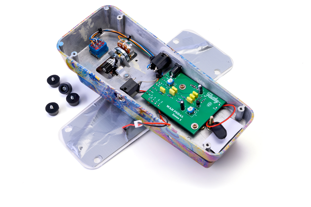 Unter der schönen Haube tuckert ein „Twin T Resonant Filter”, der im Verbund mit einem eigens für Flattley angefertigten 100-kΩ-Poti für den smoothen Sound des Wahs sorgen soll. Dieser wurde angeblich nur von einigen besonderen Wahs aus den 1960er Jahren verwendet. Ein weiteres cleveres Detail ist die Statusanzeige des Pedals. Wir alle kennen das Problem mit den meisten Wahs: Es gibt kein Lämpchen, das den Betrieb anzeigt. Deshalb weiß man nicht immer sofort, ob das Gerät überhaupt an ist.