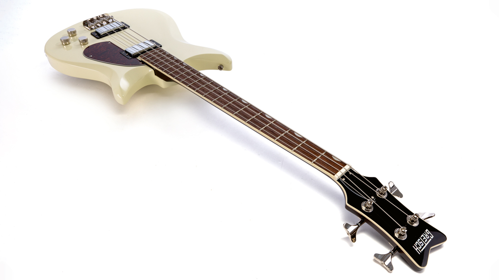 Im ersten Moment dachte ich, das wäre nur ein Streamliner Jet Club Bass Single-Cut, den ich für die April-Ausgabe zum Test hatte, mit anderer Korpusform. Weit gefehlt. Das Styling ist in der Tat gleich: Der Korpus kommt wieder in der Farbe Vintage White, einem angenehm gilblichen Farbton. Der Hals hingegen ist in einem sehr dunklen, beinahe schwarz wirkenden transparenten Braun gehalten.