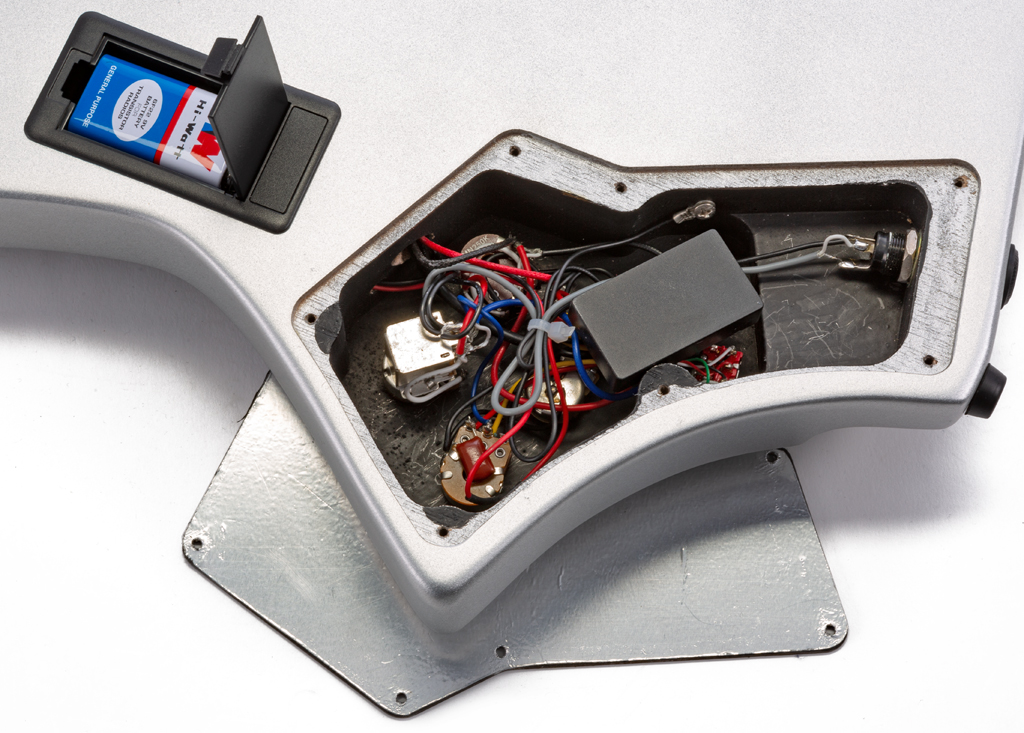 Der kompakte Mahagonikorpus ist deckend mit grau-silbernem Lack überzogen. Das mattschwarze Schlagbrett steuert einen geschmackvollen Kontrast bei, und die insgesamt eher kantige Linienführung vermittelt eine gewisse abstrakte Werkzeughaftigkeit. Gerade an den Kontaktstellen, also an der Armauflage und den Stimmmechaniken gehen die Linien in weiche Konturen über, wodurch sich ein angenehmes Handling ergibt.
