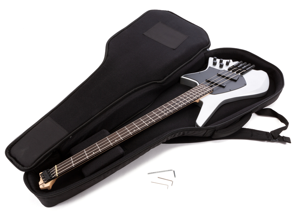Das Instrument ist mit 3,3 Kilo angenehm leicht, deutlich leichter als viele konventionelle 4-Saiter mit Vollmensur. Weder im Sitzen noch im Stehen zeigt der Bass die Balanceprobleme mancher Headless-Konstruktionen, die einem durch eine ausgeprägte Hecklastigkeit dann das Halsende gegen die Schläfe donnern. Hier hängt alles dort, wo es sein soll.
