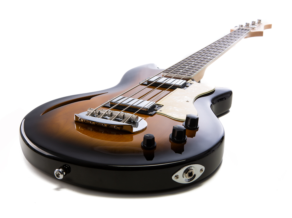 Ein Beispiel ist der Decade, den wir letztes Jahr getestet haben, oder der Hollowbody, der in Zusammenarbeit mit Michael Tobias entstand. Was uns zu unserem Testbass bringt, der sich als Hollowbody-30 vorstellt. Damit gibt er schon zwei wesentliche Merkmale preis: Zum einen ist es eine Konstruktion mit Luft im Bauch, zum anderen hat er eine Mensur von 30 Zoll – ein Shortscale-Bass also. Damit befindet er sich in guter Gesellschaft – vom EB-2 und Rivoli bis zum Beatle- und Club-Bass. Lakland verspricht jedoch, mit dem HB-30 einige Eigenheiten der Vorfahren anzugehen.