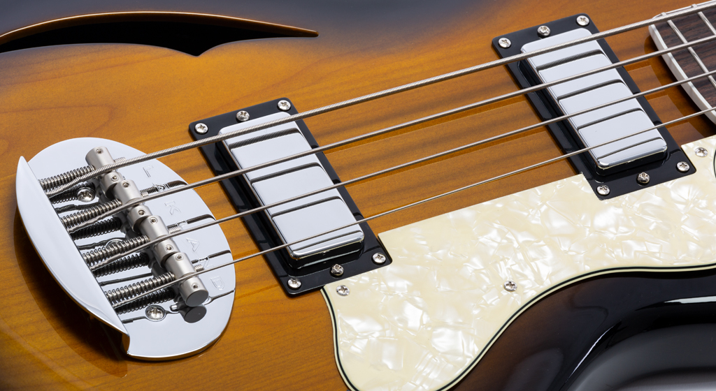 Normaler in der Konstruktion ist da der Hals. Dieser besteht aus leicht geflammtem Ahorn mit einem aufgeleimten Griffbrett aus Pau Ferro, welches eine schicke Einfassung verpasst bekommen hat. Zwanzig eher zierliche Bünde vom Typ „Vintage Spaghetti“ gibt es zu bespielen, Dots in den üblichen Lagen weisen den Weg. Während der „große“ Hollowbody noch eine ganz eigene 2/2-Kopfplatte hatte, gibt es beim HB-30 einen regulären Headstock, bei dem alle vier Hipshot-Mechaniken auf links montiert sind. Der Saitenzug ist sehr schön gerade und ein Saitenniederhalter gibt der D- und der G-Saite zusätzlichen Druck im Kunststoffsattel. Dieser ist mit 38 mm so breit wie ein normaler Jazz Bass und soll so zu einem gewohnten Spielgefühl beitragen. Mit vier Schrauben ist der Hals mit dem Korpus verbunden. Anders als bei den Klassikern, die hier meist eingeleimt waren. Die Brücke hatte ich bereits erwähnt. Ergänzend sei gesagt, dass die Saiten durchgefädelt werden müssen und die Saitenreiter für Höhe und Oktave eingestellt werden können. Der Saitenabstand beträgt feste 19 mm, was ebenfalls dazu beitragen soll, dass man sich wenig umgewöhnen muss. Die chromgekappten, in flachen Rahmen montierten Pickups sind Singlecoils mit „extended range“, wie Lakland schreibt. Aufgrund des großen Abstands zwischen Hals- und Steg-Pickup kommen fast Höfner-Vibes auf.