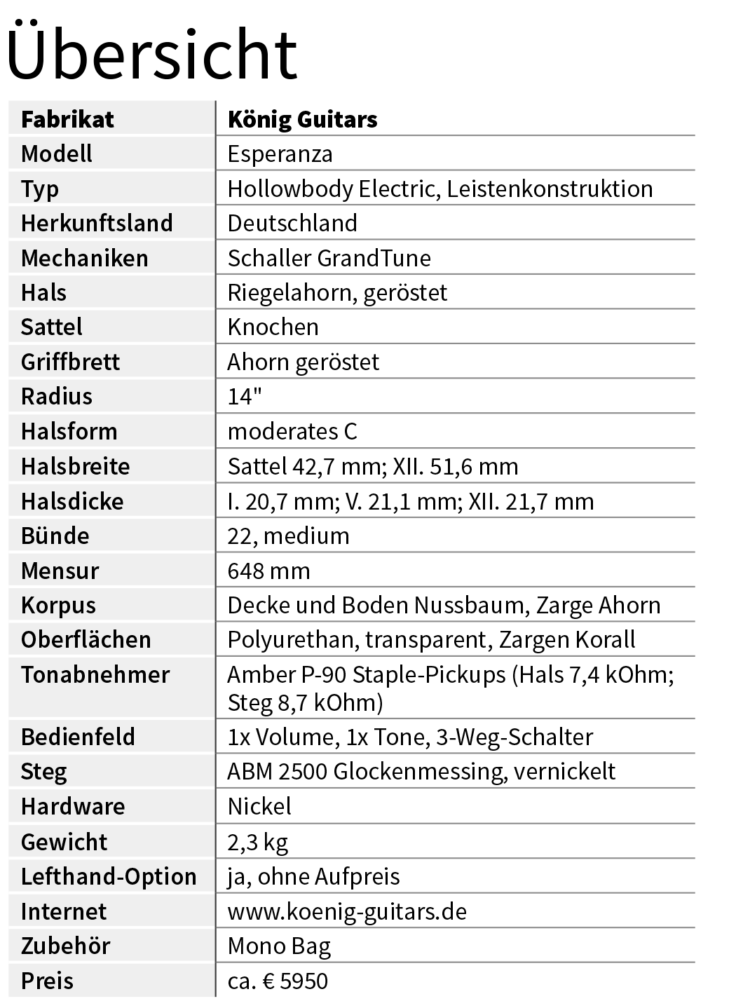 Mit ihrem hochinteressanten wie speziellen Design Esperanza zeigen die Hamburger Gitarrenbauer wieder einmal ihre hohe Kunstfertigkeit, und die richtet sich an Spieler mit Sinn, Blick und Ohr für das Besondere. Diese akustisch so stimmig und resonanzstark gebaute Gitarre ist nicht nur ungemein leicht im Gewicht, sondern auch angemessen leichtfüßig in der Tonentfaltung, was von den Amber P-90 Staple Pickups mit Transparenz und offenem Gestus elektrisch authentisch gewandelt wird. Im Ausdruck eher feingliedrig und kultiviert, ist sie wohl kaum die erste Wahl für das Verlegen grober Bretter oder das Ausleben aggressiver Angriffslust.