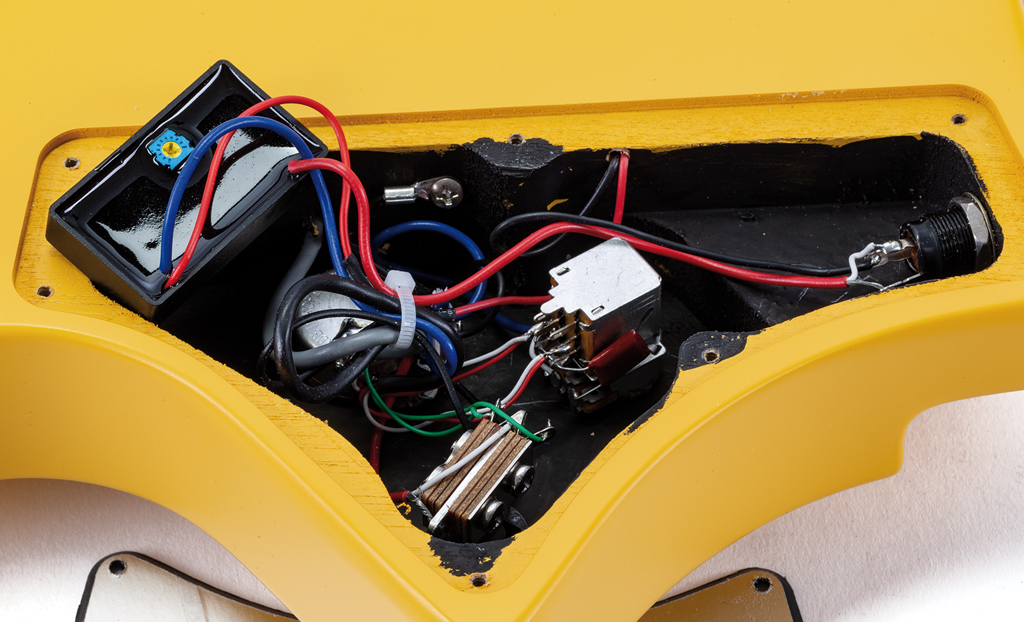 Da die Pickups schräg eingebaut sind, kann man sie nicht ohne Weiteres gegen andere Modelle tauschen. Als ich die Verarbeitung im Elektronikfach prüfen wollte, sah ich, dass es ein Trimpot fürs Gain gibt (gut!). Ich habe mich kurz gefreut, um dann zu merken, dass ich es von Gain auf noch viel mehr Gain regeln kann.