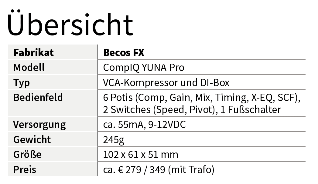 Die CompIQ-Serie von Becos hat einen besonderen Platz in meinem Herzen. Nicht nur sind alle Modelle uneingeschränkt empfehlenswert, der Testbericht zum Twain und Stella war auch mein erster für dieses Magazin. Daher freut es mich, dass sich Becos FX auch mit YUNA treu bleibt und mit herausragender Qualität sowie ausgereiften Funktionen zu überzeugen weiß. Obwohl die Grundfunktionen der Kompressoren natürlich sehr ähnlich sind, unterscheiden sie sich teils sehr drastisch durch Zusatzfunktionen in der Soundgestaltung.
