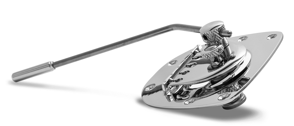 Das DG-Tremolo-System mit extrem kleiner Bauform. Die erforderliche Fräsung beträgt ca. 25 x 33mm (Durchmesser x Tiefe). Mit rundem Tremolo-Arm.