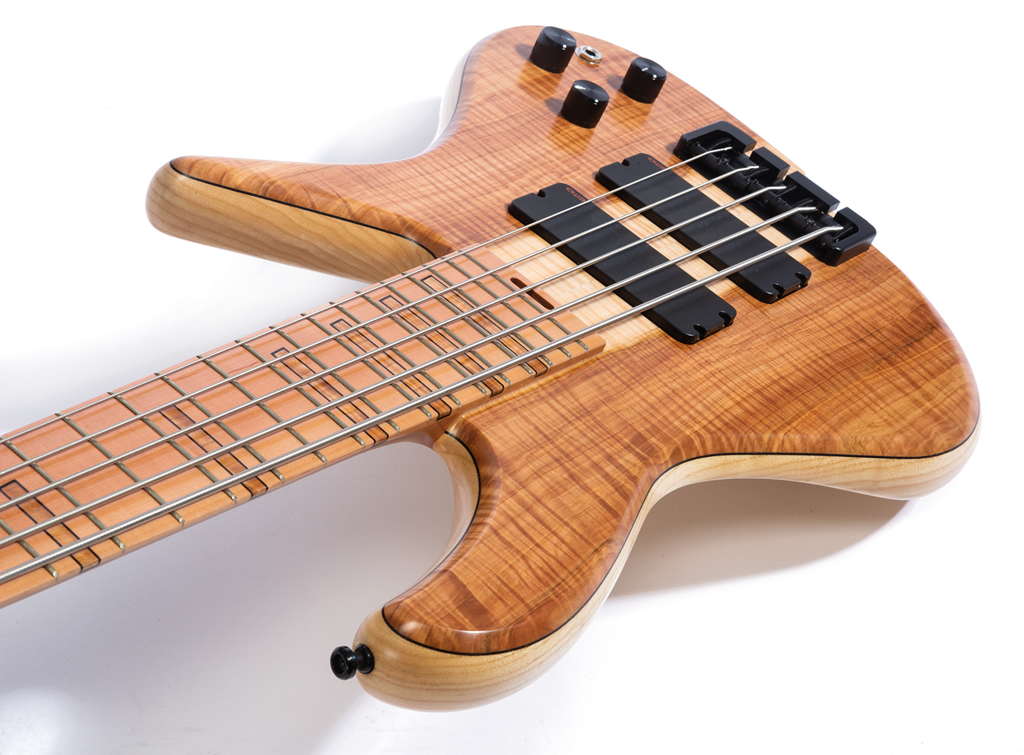 Die Korpusform wirkt vertraut und erinnert an teure Edelbässe jenseits des großen Teichs. Aber auch Torillo scheint hier durch, denn die Cutaways bzw. Korpushörner sind etwas klarer gezeichnet. Der Bürzel am Korpusende erinnert mich hingegen an die kanadische Marke F Bass – nur umgedreht. Der Body ist aus zwei Teilen Esche gefertigt, die mittig zusammengefügt wurden. Mit einer dunkel eingefärbten Zwischenlage aus Ahorn wurde eine spektakulär gemaserte Decke aus Kastanie aufgeleimt. Die Flammung, die Maserung und das helle Mittelstück, das fast den Eindruck eines durchgehenden Halses erweckt, suchen ihresgleichen. Tatsächlich ist der Hals eingeleimt – und der hat es in sich! Von vorne ist es dank eines Headstock-Overlays aus Kastanie unsichtbar, doch er entpuppt sich als elfteilige Konstruktion aus Elsbeere und Padouk in unterschiedlichen Breiten. Die Detailverliebtheit, mit der hier gearbeitet wurde, zeigt sich einerseits am Übergang in den Korpus mit einer weiteren Zwischenlage aus Bubinga. Dieser nutzt die Vorteile des tief eingesetzten Halses in Kombination mit einem großzügigen, sanften Shaping voll aus.