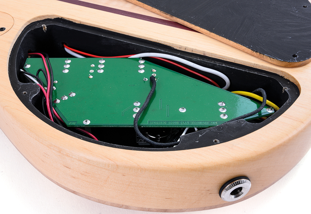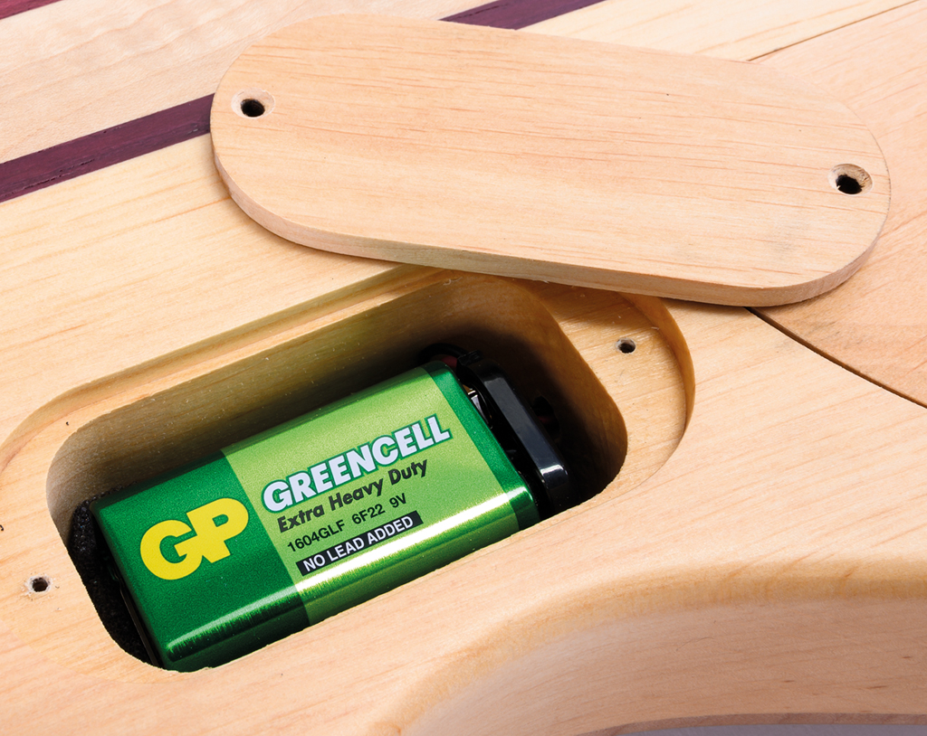 Das gesamte E-Fach füllt eine Platine aus, was sehr sauber wirkt, im Servicefall aber nicht ganz einfach sein dürfte. Im Hier und Jetzt wiegt schwerer, dass der Deckel des Batteriefaches ebenfalls aus Holz ist, aber zum einen nur mit kleinen Holzschrauben befestigt ist und sich zum anderen so präzise einpasst, dass er sich kaum herausnehmen lässt. (Ein kleiner Saugnapf schafft Abhilfe!)