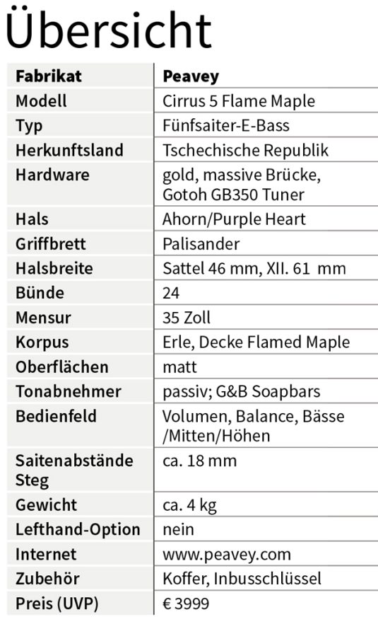 Dem blieb er bis zu seinem viel zu frühen Tod treu und war neben John Taylor von Duran Duran der auffälligste Cirrus-Botschafter. Zum Test habe ich einen brandneuen Peavey Cirrus 5 erhalten, der weder aus Meridian im US-Staat Mississippi noch aus Indonesien stammt, wie der 2017 hier im Heft getestete, sondern aus Hořovice in Tschechien. Dort sitzt die Firma NBE, die neben eigenen Marken wie Esh und Clover auch im Auftrag fertigt, zum Beispiel für Spector oder eben Peavey.