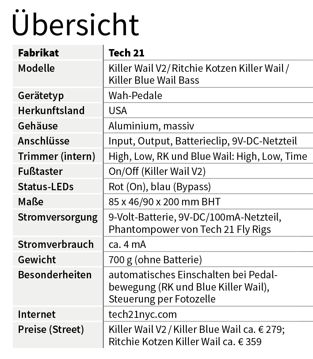 Nach dem Erfolg des original Tech-21-Killer-Wail-Wah-Wahs durfte man auf das umfassende Redesign und auf die Spezialisierung der Ritchie Kotzen Signature und Bass Wahs gespannt sein. Ergebnis: Tolles Design, Größe und Gewicht wurden erheblich reduziert, die Wah-Steuerung auf verschleiß- und geräuschfreie Optoelektronik umgestellt.