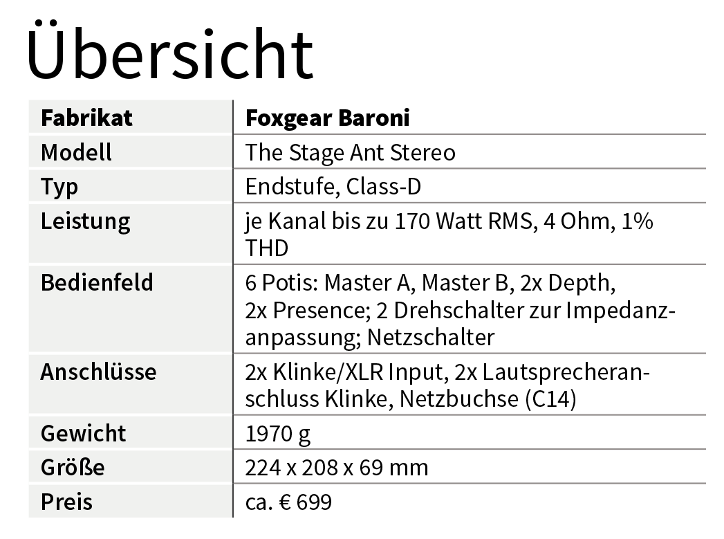 Bevor ich in den technischen Teil einsteige, folgt eine Übersicht über das Konzept und die Ausstattung der Bühnenameise. Wir haben es hier nicht mit einem Vollverstärker zu tun, sondern mit einer „nackten” Endstufe, deren Aufgabe es ist, ein fertig geformtes Instrumentensignal an den Lautsprecher zu bringen. Zur grundsätzlichen Gestaltung des Grundsounds ist also ein Preamp, ein Pedalboard oder ein Modeling-Amp erforderlich. Mit Reglern für Presence und Depth bietet die Stage Ant zwar grundlegende Möglichkeiten zur Klangformung, diese dienen jedoch eher der Anpassung an räumliche Gegebenheiten bzw. an den Lautsprecher.