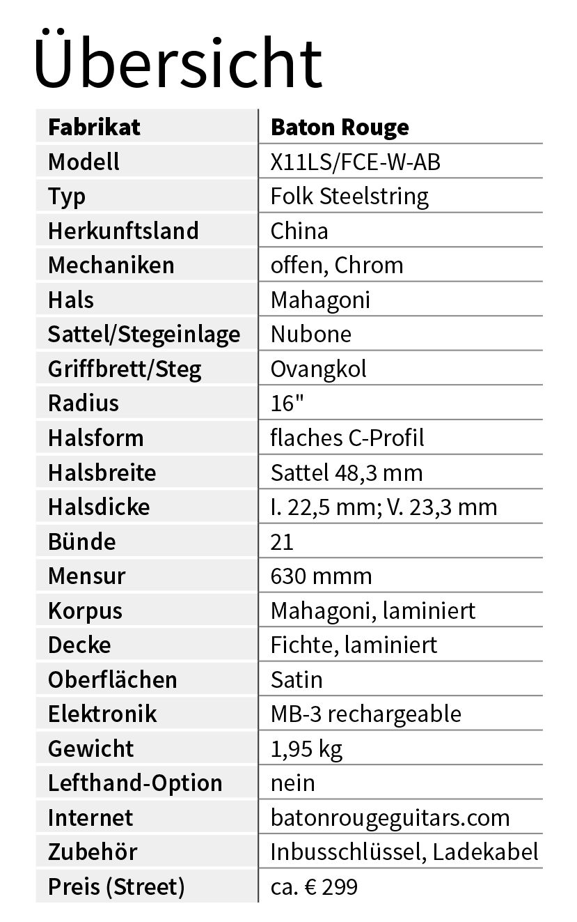 Wir haben es hier mit einem Folk-Modell zu tun (etwa die Dimensionen eines Orchestra-Modells), das im Handel für etwa € 300 zu haben ist. Somit muss sich die Baton Rouge gegen eine riesige, gut aufgestellte Konkurrenz behaupten. Schauen wir uns die Specs an.