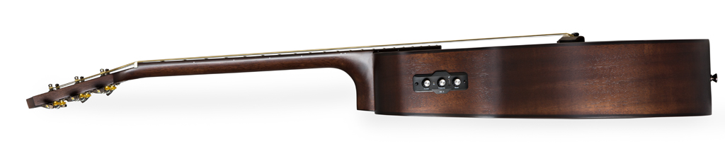 Der Korpus zeigt ein rundliches Cutaway und besteht aus Boden und Zargen aus Mahagoni. Das Holz ist offenporig matt versiegelt und kommt so charaktervoll zur Geltung. Die Decke aus Fichte präsentiert sich in einem Antique-Brown-Matt-Finish mit weißer Einfassung.