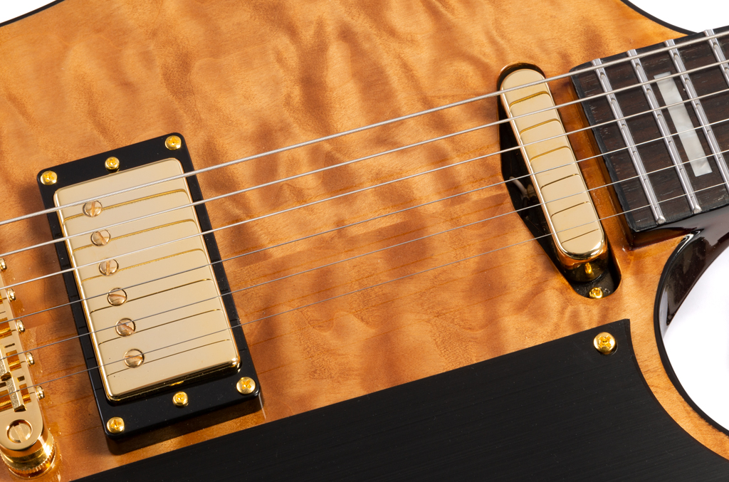Zum Schutz wurde der Decke dann noch ein Pickguard in „brushed black” aufgeschraubt. Der bespielbare Halsbereich bekam ein Thin-U-Profil verpasst und in das tiefschwarze Griffbrett aus Macassar-Ebenholz von 14″ Radius setzte man 22 Edelstahl-Bünde im Extra-Jumbo-Format, dazu noch großzügige Blockeinlagen zur Lagenkennung.