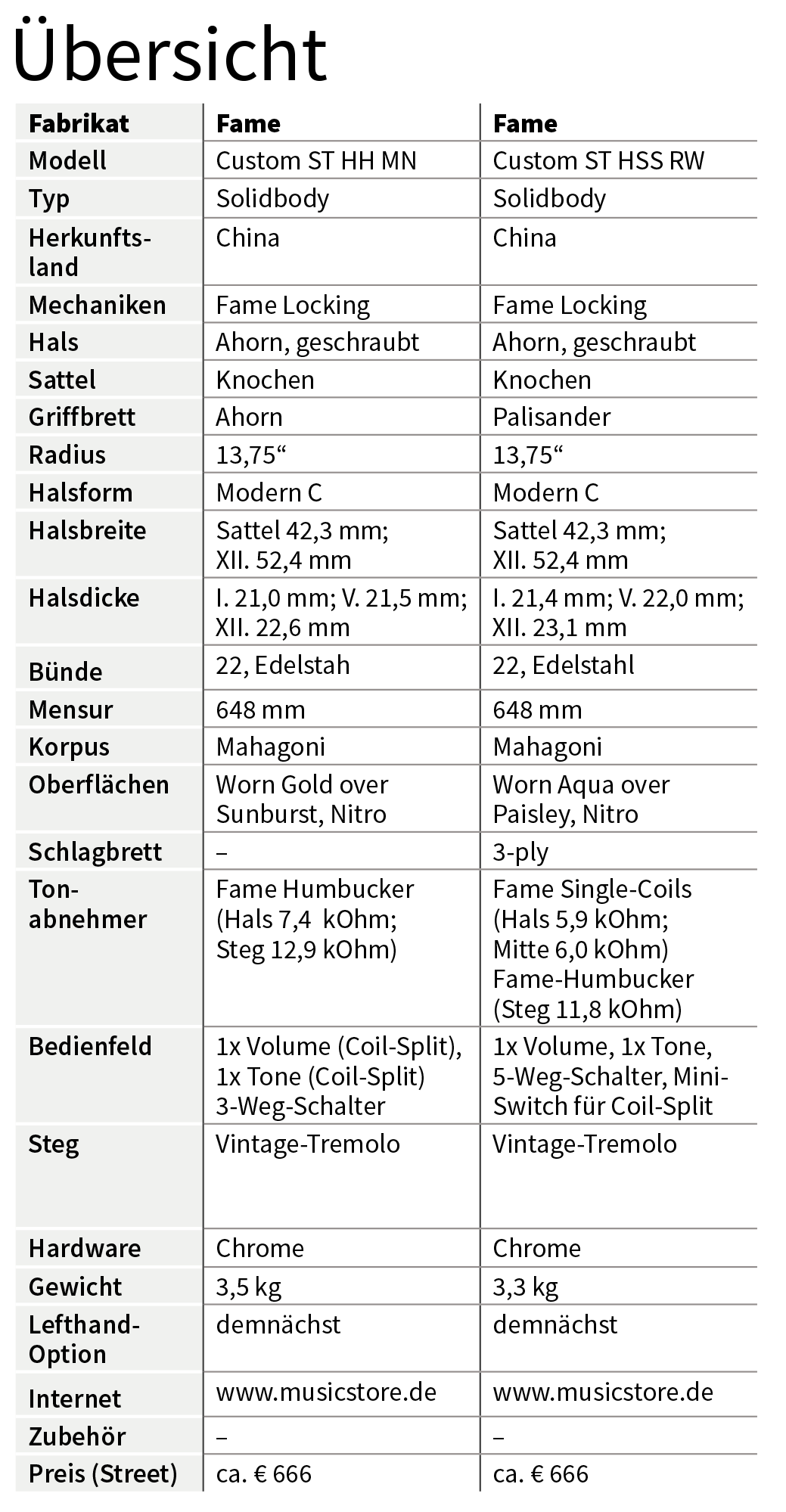 Dabei hat zumindest bei den vorliegenden Modellen die SSH-Version für mich die Nase vorne. Das bleibt natürlich wie immer persönlich abzuprüfen! Qual der Wahl? Nicht wirklich, wenn du sie einmal vergleichend in die Hand nimmst. Gut gemacht sind diese Fame Custom ST-Modelle auf jeden Fall. Ein Paket, das sich nicht nur vom Preis-Leistungsniveau her wirklich sehen lassen kann – Daumen hoch!
