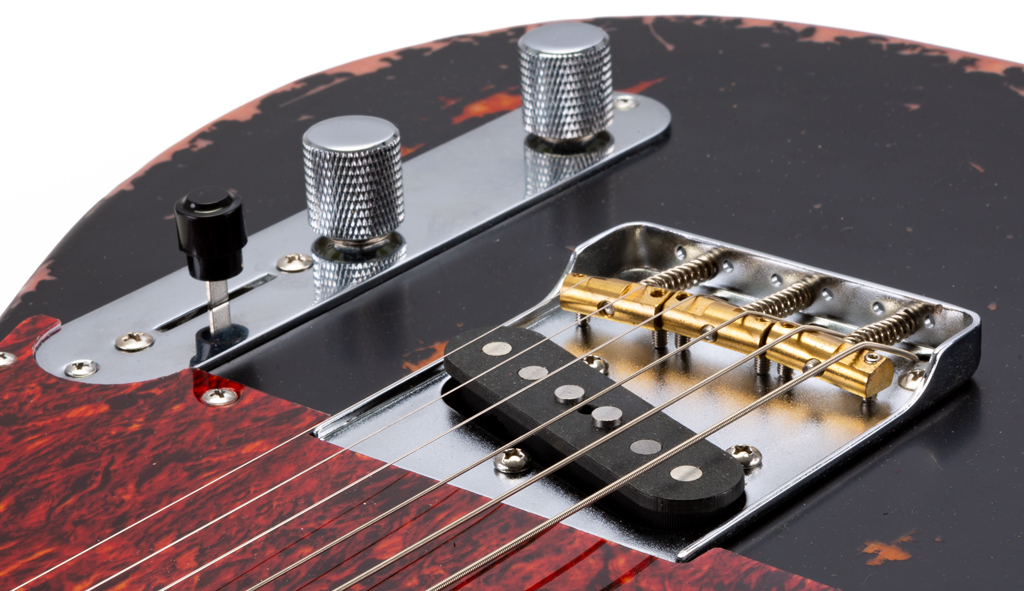 Alle Ausfräsungen unter dem Pickguard und der Controlplate sind sorgfältig mit Kupferfolie abgeschirmt, und die Signale der beiden hauseigenen T-Style-Pickups werden wie gewohnt von einem Dreiwegschalter sowie Master-Volume- und -Tone-Regler verwaltet. Sowohl Schalter als auch die beiden 250k-Potis stammen vom Hersteller Alpha und stellen eine ordentliche Qualität dar.