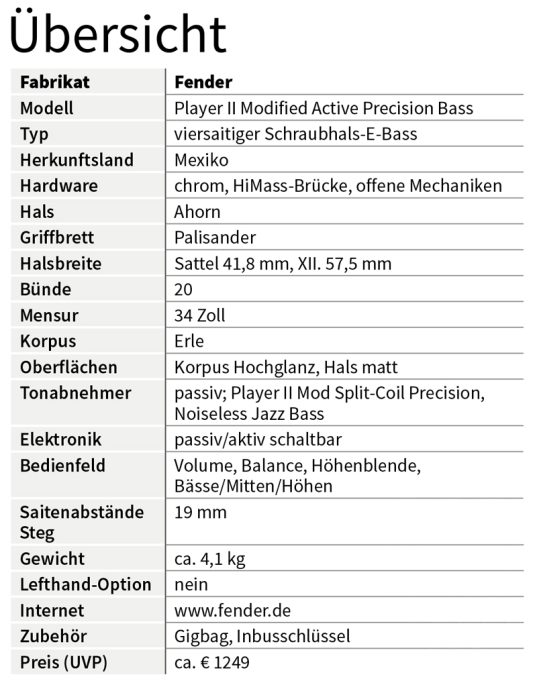 Viel hat sich ja gegenüber dem Player Plus Preci nicht getan, aber für meinen Geschmack greifen die Veränderung an genau den richtigen, entscheidenden Punkten. Palisander oder Pau Ferro ist dabei noch gar nicht soo wichtig, aber die Mechaniken mit ihren konischen Achsen und die passive Höhenblende, die zudem auch im aktiven Betrieb mit im Spiel ist, heben den eh schon funktionalen Bass auf eine noch höhere Stufe und machen ihn zu einem perfekten Arbeitsgerät. Aus eigener Erfahrung weiß ich, dass die US-Modelle noch mehr Detailverbesserungen bieten, ein je nach persönlicher Neigung noch besseres Spielgefühl, und einen nicht zu unterschätzenden Koffer noch dazu, aber der Abstand ist mit dem Player II Modified Active Precision Bass kleiner geworden – und das für die Hälfte des Preises … Klare Antestempfehlung! ●