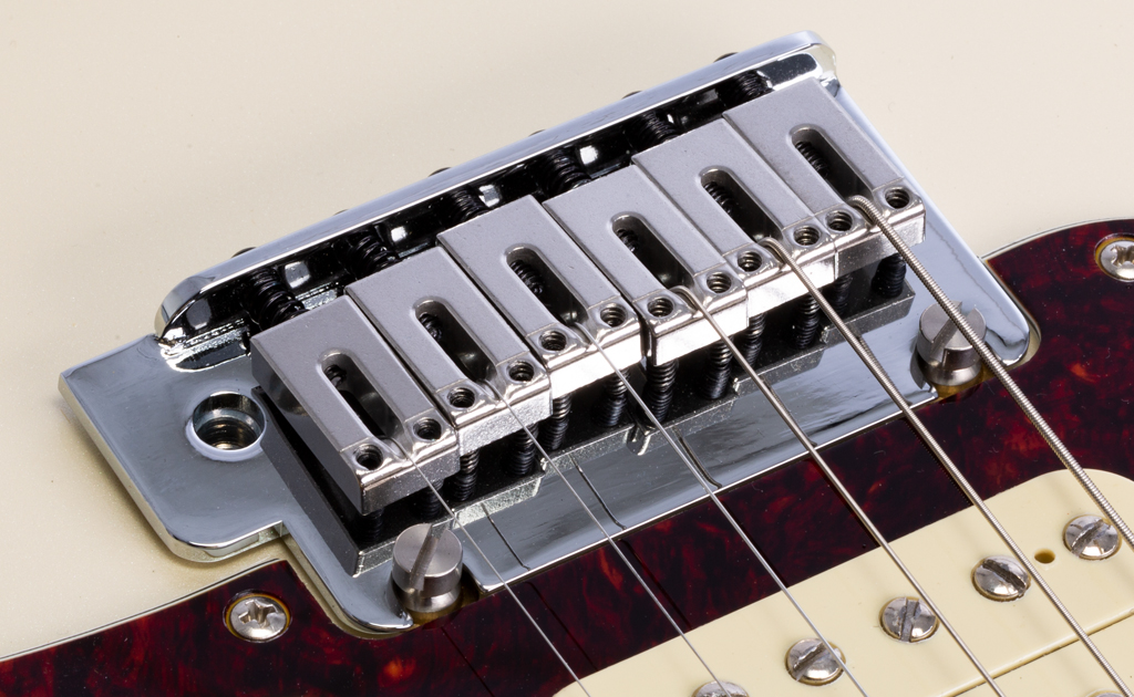 Die Saiten werden (E und B werden von einem modernen „String Tree” niedergehalten) über einen schmalen TUSQ-Sattel mit klassischer 648-mm-Mensur zum 2-Punkt-Tremolo mit einzeln beweglichen Block-Stahl-Saitenreitern und unten abgefastem Tremolo-Block geführt.