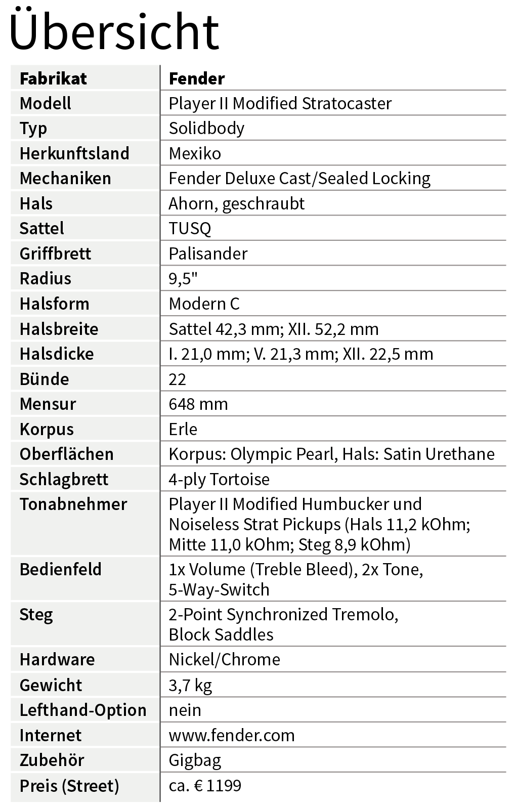 Die Player II Modified Stratocaster ist mit knapp 3,7 kg gut tragbar und in Sachen Anlage, Ausrichtung, Haptik und Zugang gibt es wie gewohnt nur modelltypische Bestwerte zu nennen. Der Hals mit Modern-C-Profil trifft in Sachen Spielkomfort so etwas wie eine goldene Mitte, individuelle Wünsche einmal außen vor gelassen, und die bestens entgrateten Griffbrettkanten mit perfekt daran angepassten und sauber abgeglichenen Medium-Jumbo-Bünde tun ein Übriges, um sofort und wie selbstverständlich mit dieser Strat ins Geschäft zu kommen.
