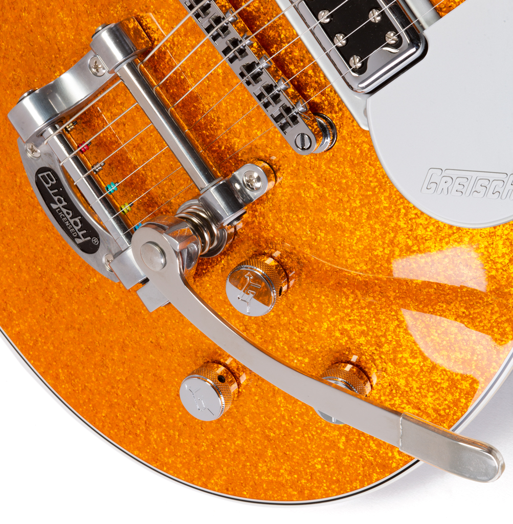 Elektrik: Für die zwei eingesetzten FT-5E Filter’Tron Humbucking Pickups mit doppelt gereihten Polschrauben stehen individuelle Lautstärkeregler, ein Master-Volume (mit „treble bleed circuit”) und ein Master-Tone zur Kontrolle bereit. G-Arrow Reglerknöpfe vermitteln klassische Gretsch-Flair. Über den 3-Wege-Schalter lassen sich die Tonabnehmer in konventioneller Manier einzeln oder zusammen anwählen.