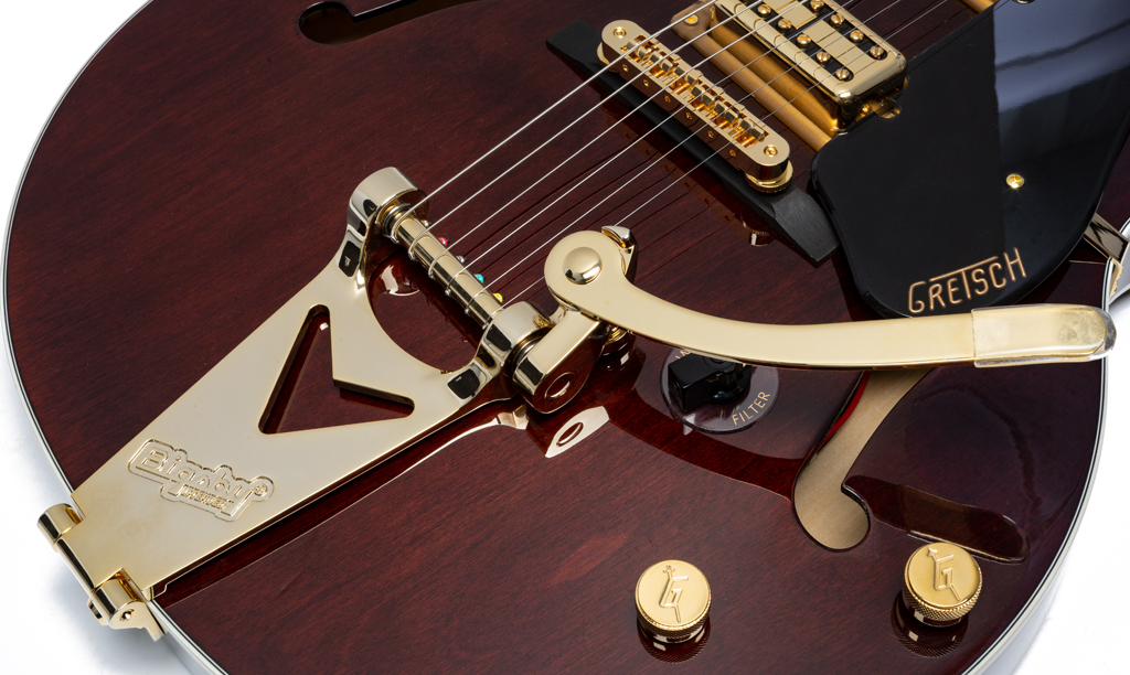 Moderner Bonus sind die ebenfalls goldenen Klemmmechaniken in versiegelten Gussgehäusen, von denen aus die Saiten über den Graph-Tech-TUSQ-XL-Sattel mit 625 mm-Mensur hinüber zur Adjusto-Matic-Bridge auf fixierter Ebenholzbasis geführt werden. Dahinter sind sie in ein klassisches Bigsby B60 V-Cutout Vibrato Tailpiece eingehängt.