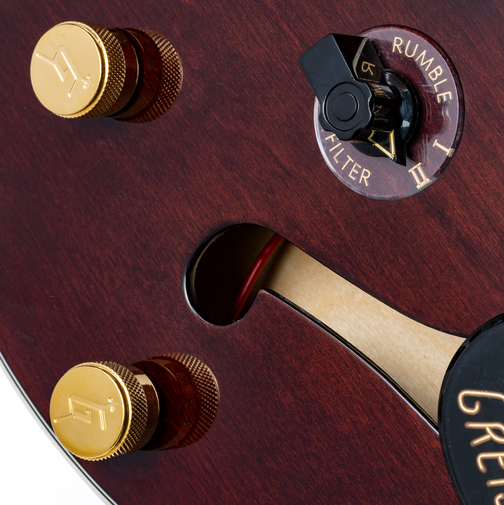 Elektrik: Zwei in Zusammenarbeit mit den Abbey-Road-Toningenieuren abgestimmte Custom-Filter’Tron-Pickups mit Alnico-5-Magneten lassen sich mit dem 3-Wege-Toggle-Switch auf dem oberen Horn konventionell einzeln oder zusammen anwählen. Zur elektrischen Kontrolle stehen bereit: Master Volume, Tone 1 (Neck Pickup mit Push-Pull für Rumble Filter) und Tone 2 (Bridge Pickup mit Push-Pull für Rumble Filter). Die zwei Stufen der Rumble-Filter-Schaltung werden mit einem auf der Decke neben dem Bigsby platzierten Drehschalter angewählt.