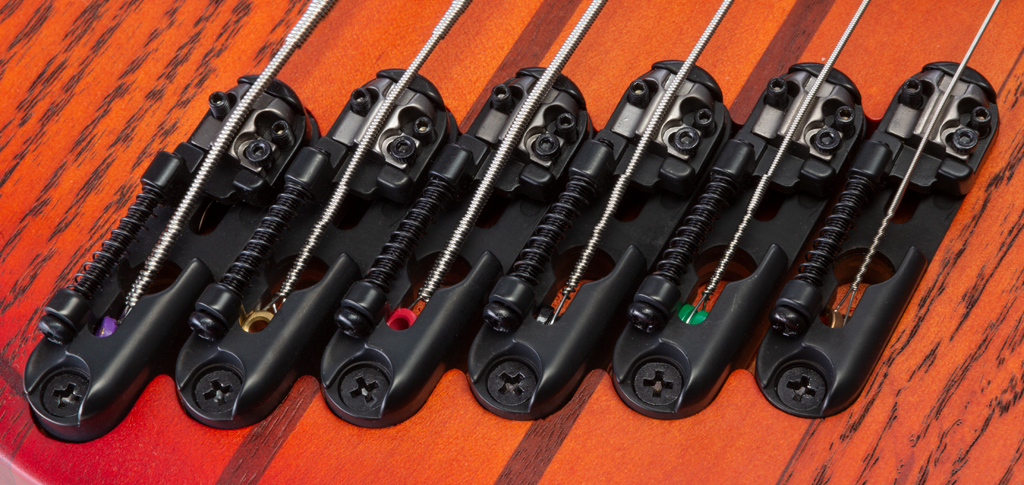 Die Saiten sind von D’Addario und wurden aus einzelnen NYXL-Saiten zusammengestellt. Wenn ein Wechsel ansteht, muss also ein passender Satz besorgt werden, wobei besonders auf die Länge der beiden tiefsten Saiten zu achten ist. Die Mechaniken sind in Gotoh-Manier gekapselte Modelle, die Brücke setzt sich aus sechs Ibanez-eigenen Monorails zusammen.