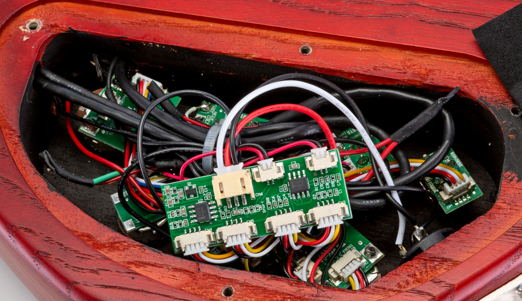 Die Batterie sitzt in einem eigenen Fach auf der Rückseite und ist ohne Werkzeug austauschbar. Ein Schraubendreher ist nötig für den Blick ins E-Fach, was ich schnell wieder zumache angesichts des Kabelwusts und der freifliegenden Platine, die immerhin gegen Kurzschlüsse isoliert ist. Na, Hauptsache funktioniert, und da kenne ich Ibanez als sehr zuverlässig.
