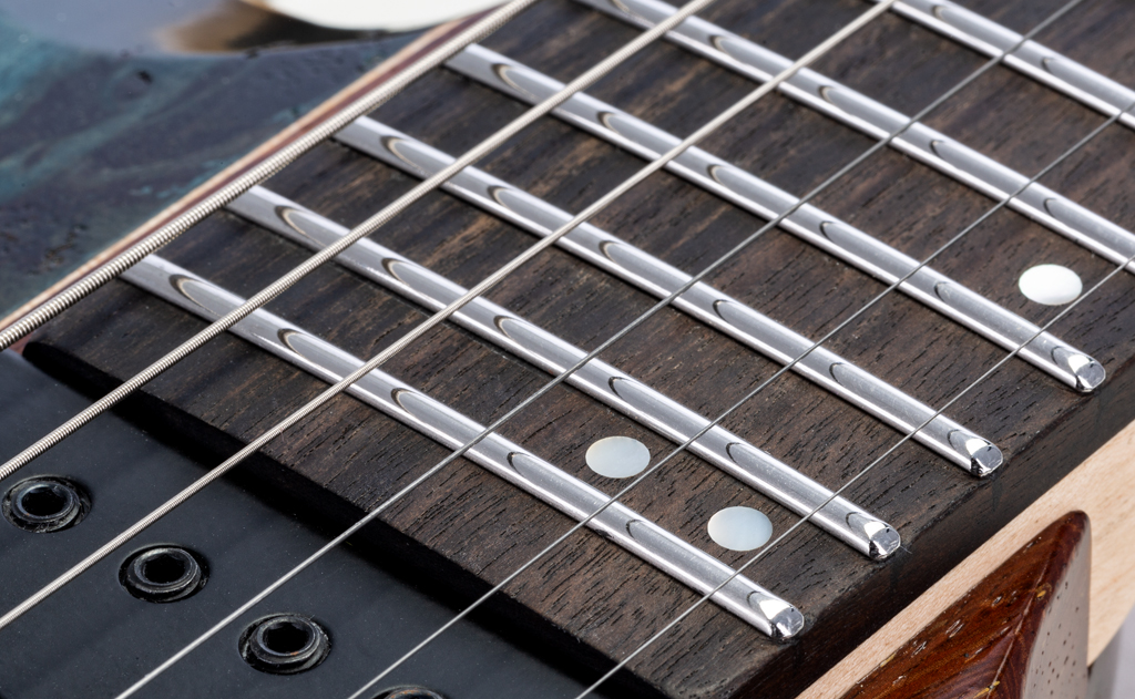 Das feinporige Ebenholzgriffbrett trägt 24, inklusive der Kanten, vorbildlich bearbeitete Jumbobünde aus Edelstahl. Als Positionsmarkierungen dienen exzentrisch angeordnete Perlmuttpunkte und fluoreszierende Side Dots. Den Klemmsattel hat man mit optimaler Saitenlage eingepasst, und der inzwischen obligatorische Ibanez-Schwenkdeckel verschließt den Zugang zum Halsjustierstab.