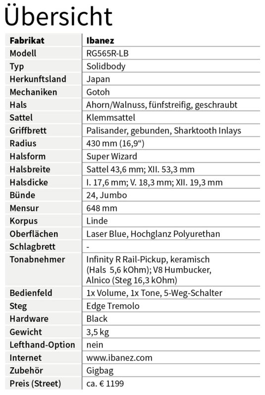 Nostalgia! Obwohl aus heutiger Sicht wie ein Rückgriff in eine vergangene Ära, ist nach kurzer Gewöhnung und Einspielzeit nicht zu verhehlen: diese neuaufgelegte Flachhals-RG macht richtig Spaß! Shredder aller Länder vereinigt euch, hier ist lange vernachlässigtes Terrain zu verteidigen. Klar funktioniert das auch für Rhythmusgitarristen, aber wer Saitenakrobatik praktiziert und die Finger gerne laufen lässt, der kann mit der RG565R-LB wirklich erleben, was für ein vitales Leben dieser alten Konzeption doch immer noch abzutrotzen ist. So ein flaches Halsprofil ist schon etwas aus der Mode geraten und bestimmt nicht jedermanns Sache, bietet aber eigentlich genau das, was es immer versprach: eine leicht zugängliche Spielwiese für flinke Finger. Ihre elektrische Schlagkraft bezieht die RG aus dem kraftvollen Steg-Pickup, daneben aber sorgt der keramische Rail-Pickup am Hals zusammen mit den pfiffigen Verschaltungen für große klangliche Beweglichkeit. Mit Blick auf den Preis ist erstaunlich, dass die Gitarre tatsächlich in Japan gefertigt wurde. Nicht ohne Grund immer ein Versprechen für hohe Qualität. Aber hilft ja alles nix – musst du einfach selbst in die Hand nehmen! ●