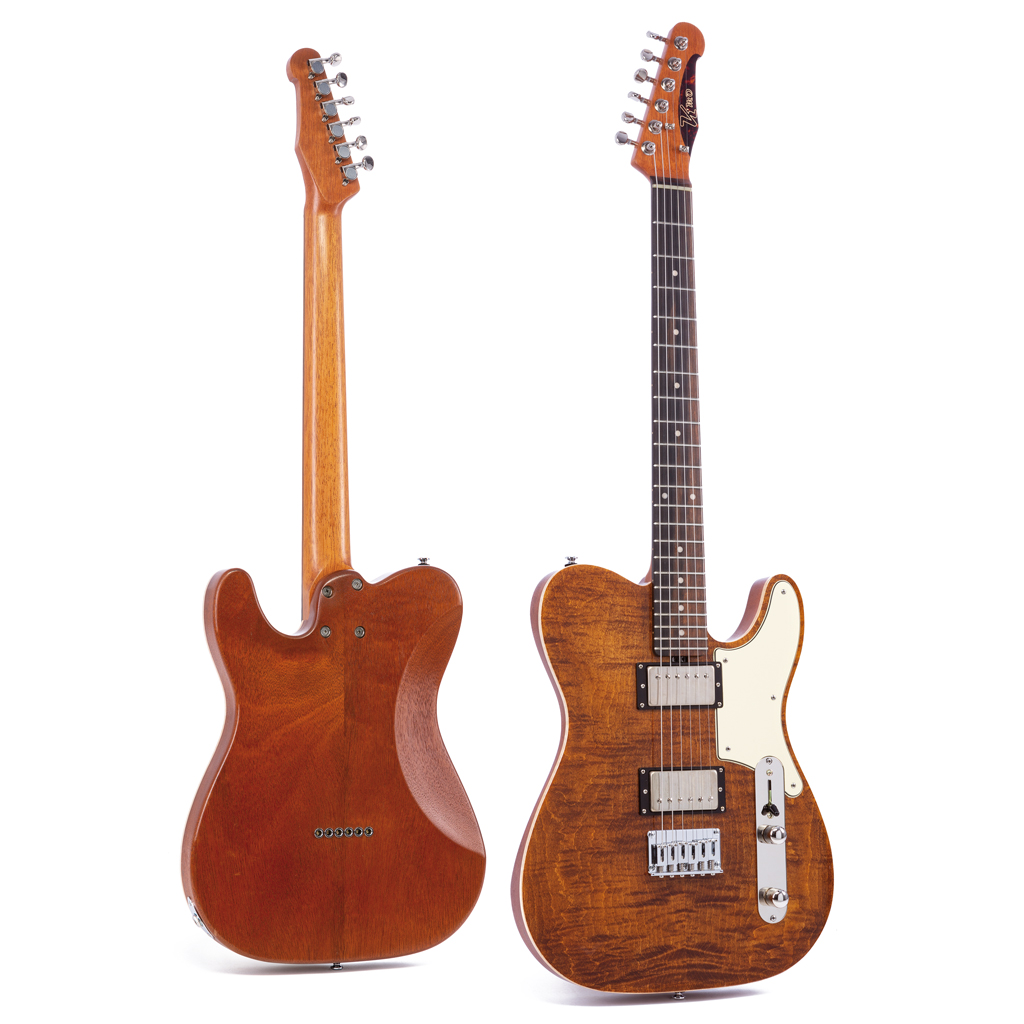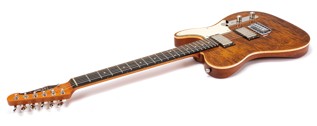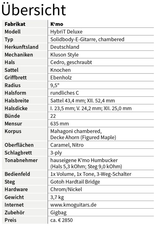 Nachweis gelungen: K’mo Guitars legen die Latte nochmals höher. Mit seinem Modell HybriT Deluxe zeigt Moe Hassan ein feines Gespür für das Zusammenspiel der Kräfte, wenn es um die Generierung geschmackvoll differenzierter Sounds geht. Die Konstruktion von Mahagonibody mit geschraubtem Hals aus Cedro sorgt in der Auslegung mit zwei Humbuckern für ein integres Tonbild mit viel Freiraum für die klangfarbliche Gestaltung. Das ist nicht zuletzt den auf recht unterschiedliche Zielrichtungen hin gewickelten Tonabnehmern zu danken, die vom angelehnt kernig-cremigen Tele-Charme des Hals-Pickups bis hin zur drückenden Rock Power des auf mittige Herztöne zielenden Steg-Humbuckers reichen und dabei viele Zwischentöne zulassen. Da nun auch noch der kräftig, rundlich profilierte Hals ausgesprochen griffig in die Hand fällt und mit seiner sauberen, Plek-finalisierten Bundbearbeitung für höchsten Spielkomfort sorgt, erfährt die zuvor suggerierte, ja, auch erwartete Verfeinerung erfreulich professionelle Bestätigung. Ein tolles, klanglich bewegliches Instrument mit einem Top-Preis-/Leistungsverhältnis, das sich übrigens auch noch recht umfassend (Halsprofil, Pickup-Konfiguration, Farbgebung u. ä.) nach persönlichen Wünschen vom Kunden mitgestalten lässt. Na dann: Gut Holz! ●