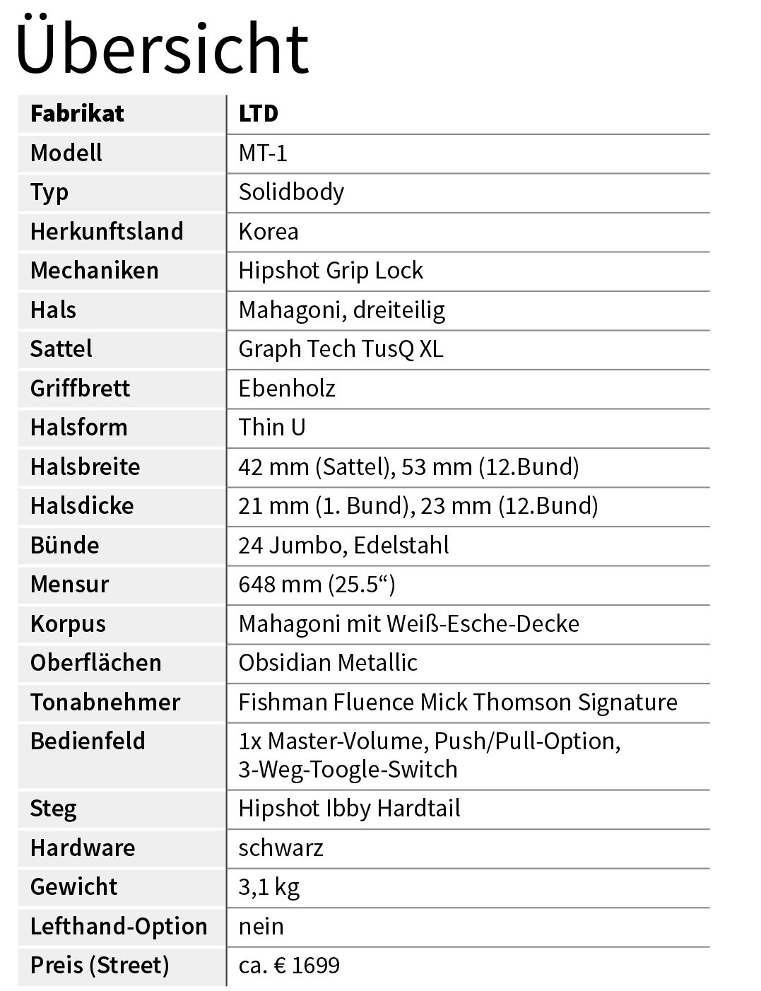 Auf der Reverse-Kopfplatte befinden sich – ebenfalls ein Novum bei einer LTD-Gitarre – sechs offene Hipshot-Grip-Lock-Tuner in Schwarz. Für die elektrische Übertragung sorgt bei der LTD MT-1 ein einzelner Mick-Thomson-Signature-Humbucker aus Fishmans erfolgreicher Fluence-Baureihe. Der Lautstärkeregler verfügt über eine Push/Pull-Funktion, mit der sich zwischen Voice 1 (Modern Active) und Voice 3 (Singlecoil-Style) wählen lässt.