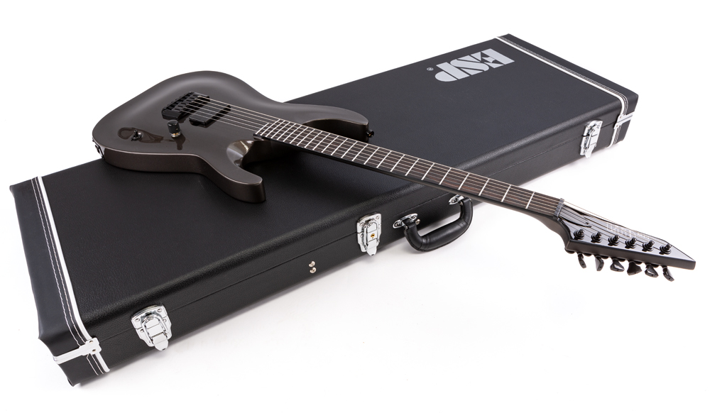Auf den ersten Blick handelt es sich bei unserem Testinstrument um eine erstaunlich schlicht gehaltene Gitarre der altgedienten MH-Serie, die im weitesten Sinne LTDs Interpretation einer Superstrat darstellt. Der 40 mm starke Korpus aus Mahagoni wurde auf Wunsch von Mick Thomson mit einer Decke aus Esche ausgestattet, um bei tiefen Stimmungen genug Attack und Durchsetzungsfähigkeit zu bekommen. Der eingeleimte, dreiteilige Mahagoni-Hals wurde dank der „Set-Thru”-Bauweise so in den Korpus eingepasst, dass sich das Spielgefühl eines durchgehenden Halses ergibt.