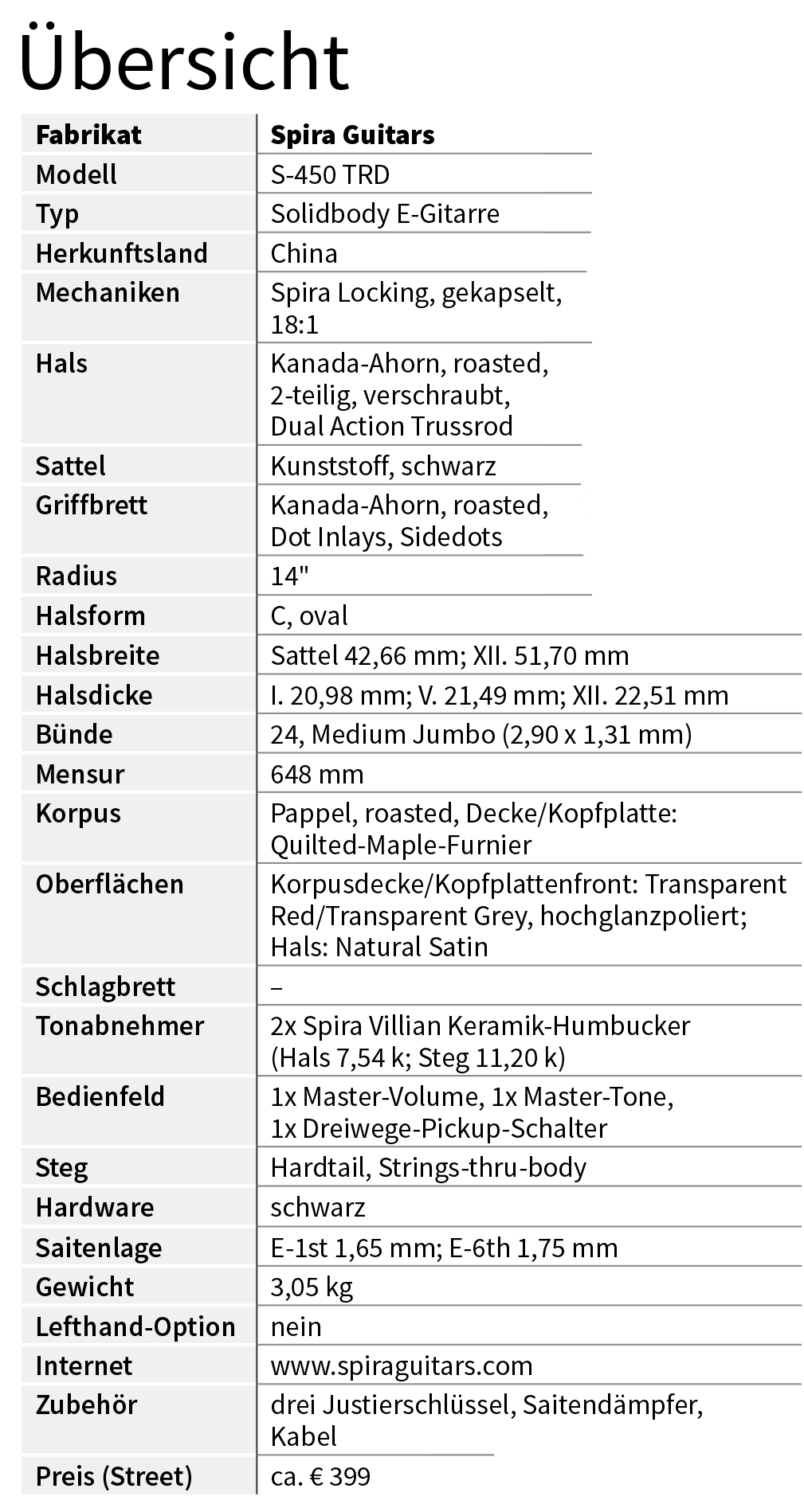 Die durch den deplatzierten vorderen Gurtpin verursachte Kopfplastigkeit hätte man bei sorgfältiger Endkontrolle ebenso feststellen müssen, wie die scharfkantigen Bridge-Schrauben bei Einstellung einer praktikablen Saitenlage. Trotz dieser Fauxpas komme ich nicht umhin, der Spira S-450 ein sehr gutes Preis-Leistungs-Verhältnis zu attestieren.