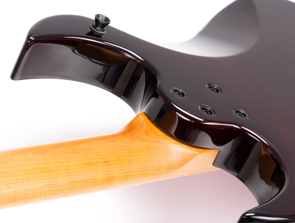 Die Thermobehandlung des Ahornhalses, der in Höhe der Bünde 1-3 großflächig geschäftet wurde, erkennt man schon an seiner bräunlichen Färbung. Das Ahorngriffbrett ist aufgeleimt, man spricht von „Maple Cap”. Die äußerst präzise gefräste Halstasche lässt keinerlei seitliche Bewegung zu. Sitzt, passt und hat null Luft. Vier einzeln unterlegte Schrauben garantieren eine stabile Verbindung mit bester Schwingungsübertragung.