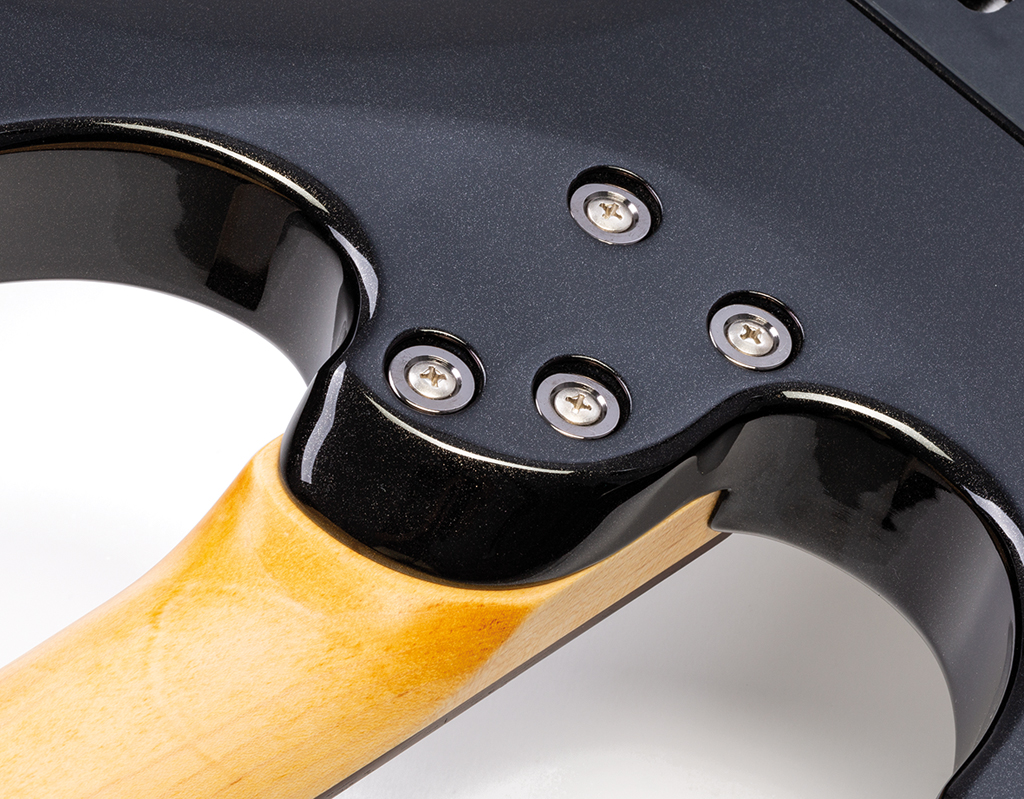 Die Hälse zeigen liegende Jahresringe und sind mit feinporigen Palisander- bzw. Ahorngriffbrettern mit Compound-Radien von 10-14″ ausgestattet. Auf diesen verteilen sich 22 vorbildlich bearbeitete und polierte Mediumbünde aus Edelstahl. Präzise und passgenau in den Halstaschen eingebettet und von jeweils 4 einzeln unterlegten Schrauben gehalten, gibt sich die Hals/Korpus-Verbindung äußerst stabil und garantiert beste Schwingungsübertragung. Die komfortable Einstellung der Halskrümmung übernehmen ein stirnseitiges Justierrad und der beiliegende Stahlstift. Optimal abgerichtete GraphTech-Tusq-Sättel führen die Saiten zu den präzise und smooth arbeitenden Gotoh Magnum Lock-Trad Tunern.