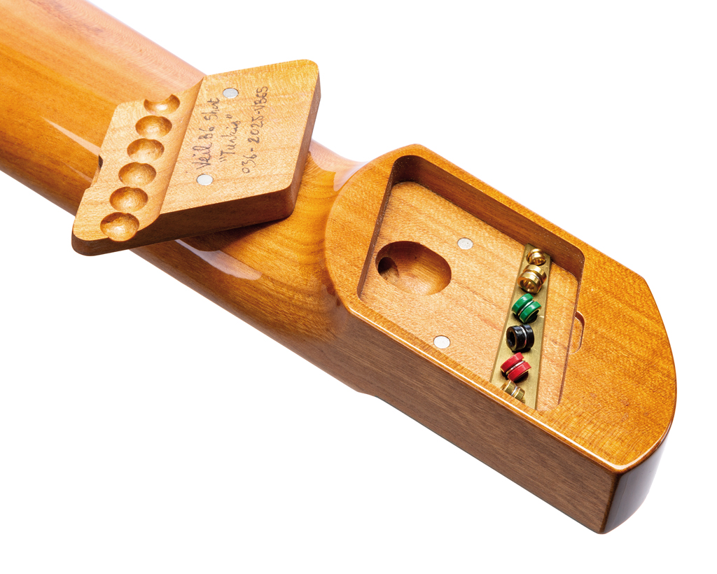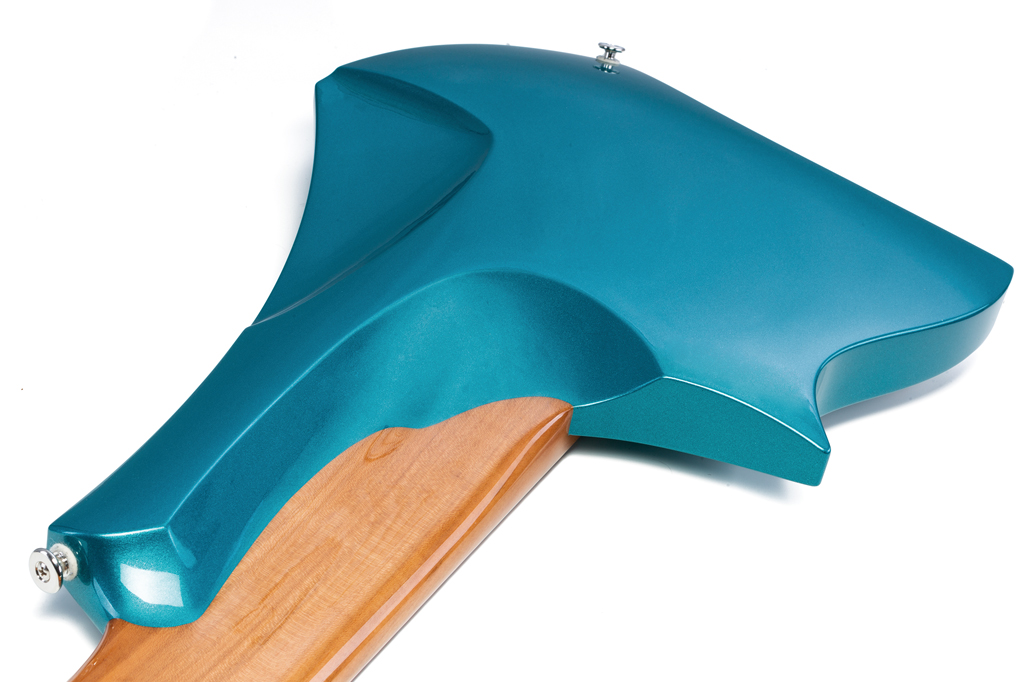 Auf dem kleinen Kopfstück, das passend zum Korpus im gleichen Türkis lackiert ist, prangt nicht nur das Herstellerlogo, es bietet auch eine weitere Funktion. Rückseitig befindet sich ein magnetischer Deckel, der zum einen den Zugang zum Halsstab verdeckt sowie auch die Saitenaufnahme. Anders als bei vielen anderen Headless-Lösungen werden die Saiten hier nicht am Sattel geklemmt, sondern an der Bridge und am Sattel werden lediglich die Ball-Ends gehalten. Bei früheren Modellen von Meta wurde eine Brückenkonstruktion verbaut, die sowohl beim Saitenwechsel als auch beim Setup sehr fummelig zu bedienen war. Mittlerweile verbaut Meta eine clevere Konstruktion aus eigener Entwicklung.